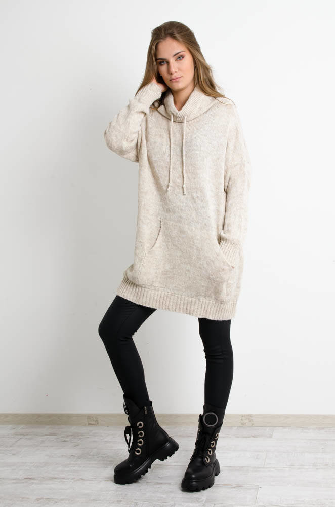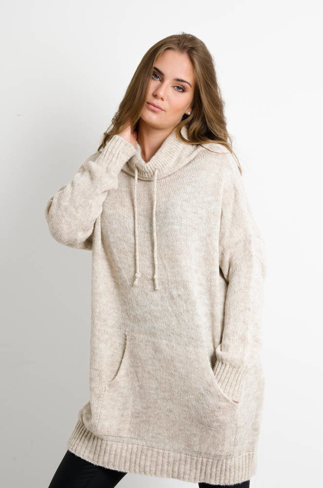 DŁUGI BEŻOWY SWETER Z KIESZENAMI