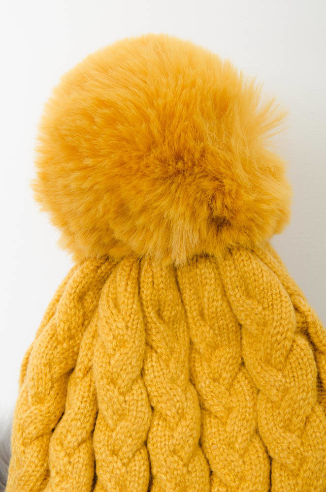 MUSZTARDOWA ZIMOWA CZAPKA PLECIONA Z POMPONEM