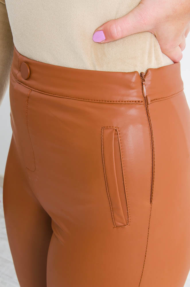 BRĄZOWE SPODNIE Z IMITACJI SKÓRY Z WYSOKIM STANEM