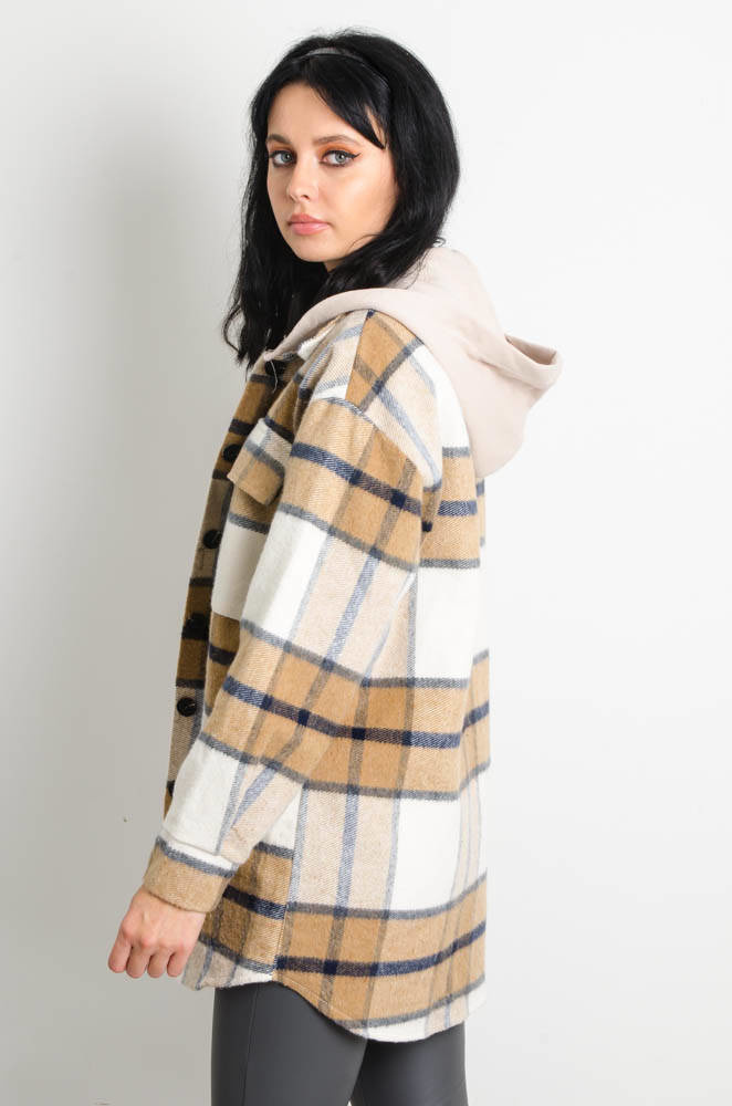 BEŻOWA KURTKA KOSZULA W KRATĘ Z KAPTUREM