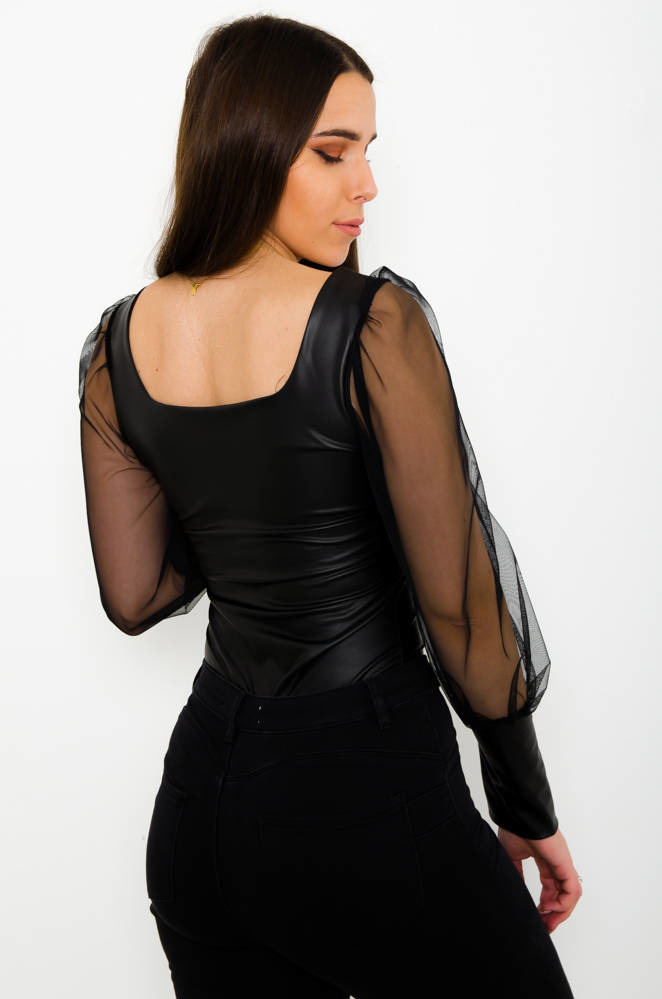 CZARNE BODY Z IMITACJI SKÓRY Z TIULOWYMI RĘKAWAMI