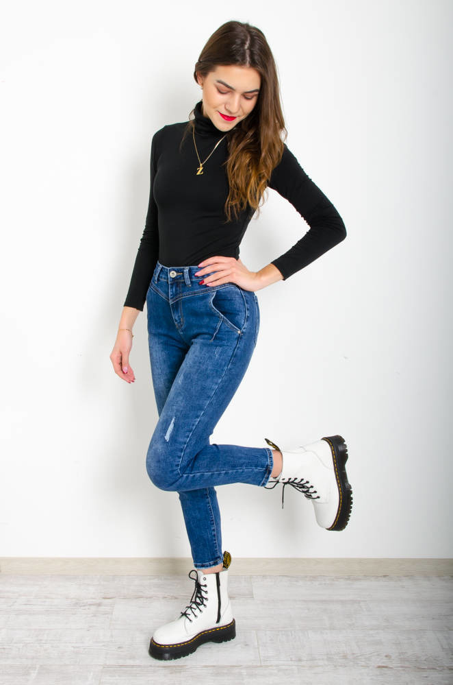 Jeansy z lekko elastycznego denimu z wysokim stanem. Dopasowująca się guma w pasie, rozporek zapinany na guzik i i suwak. Nieco luźniejszy fason, zwężane nogawki do kostki z przetarciami.