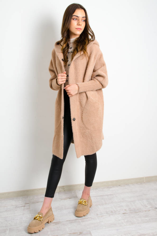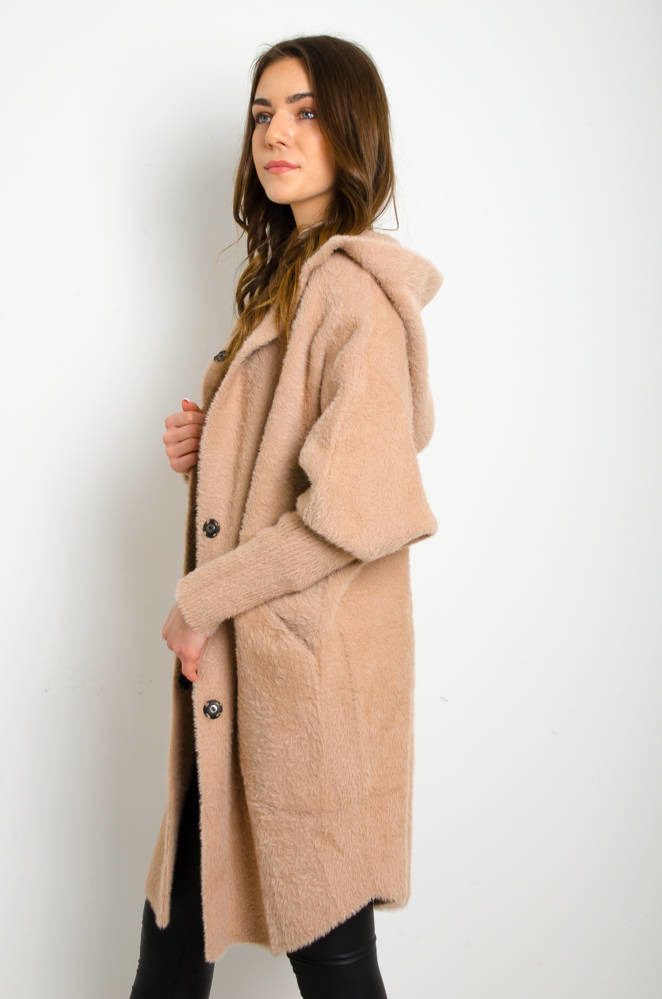 PŁASZCZ DŁUGI WEŁNIANY ALPAKA Z KAPTUREM- BRĄZOWY