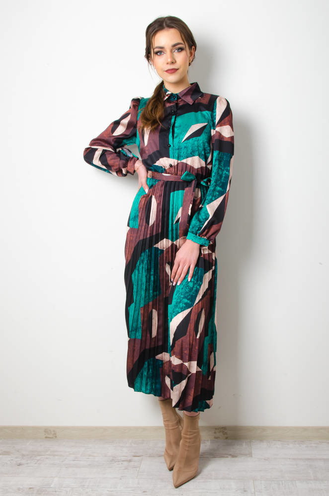 SUKIENKA DŁUGA WE WZORY Z PLISOWANYM DOŁEM- BRĄZOWO-ZIELONA