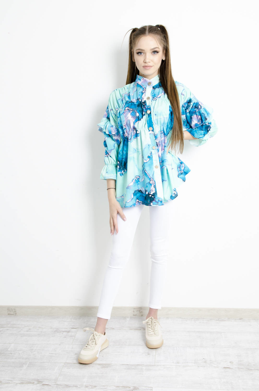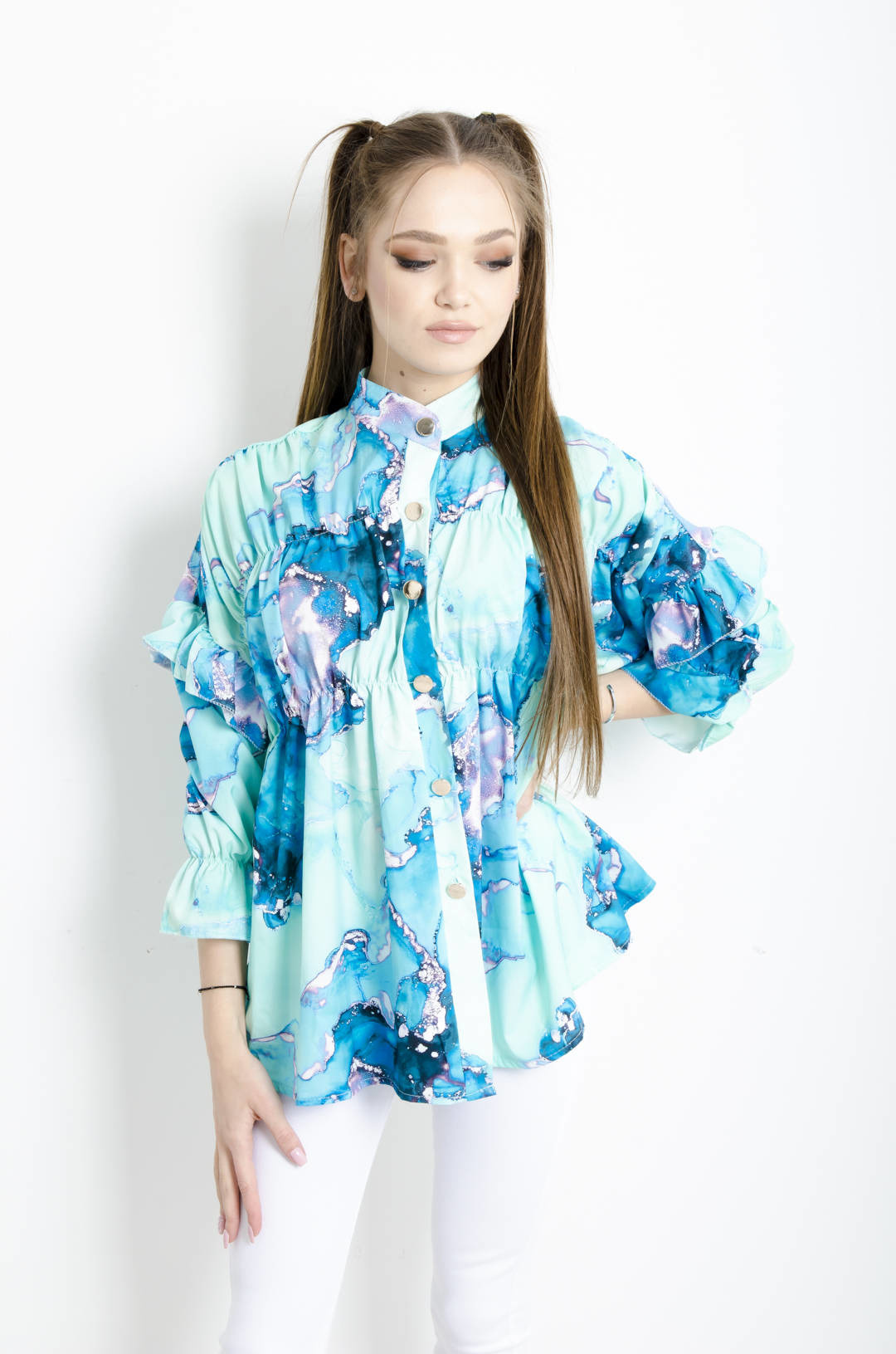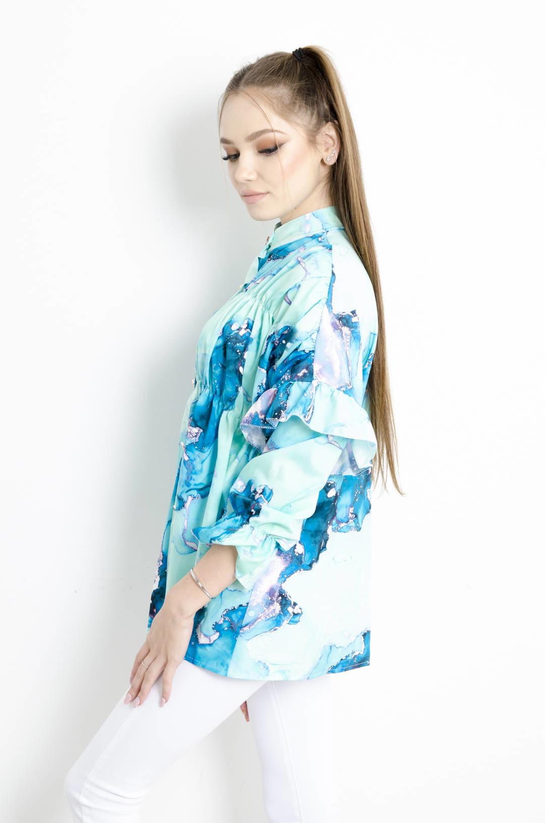 KOSZULA  MARMURKOWA Z FALBANAMI NA RĘKAWACH - ZIELONA