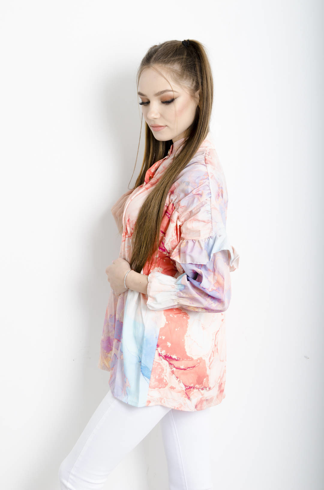 KOSZULA MARMURKOWA Z FALBANAMI NA RĘKAWACH -POMARAŃCZOWA