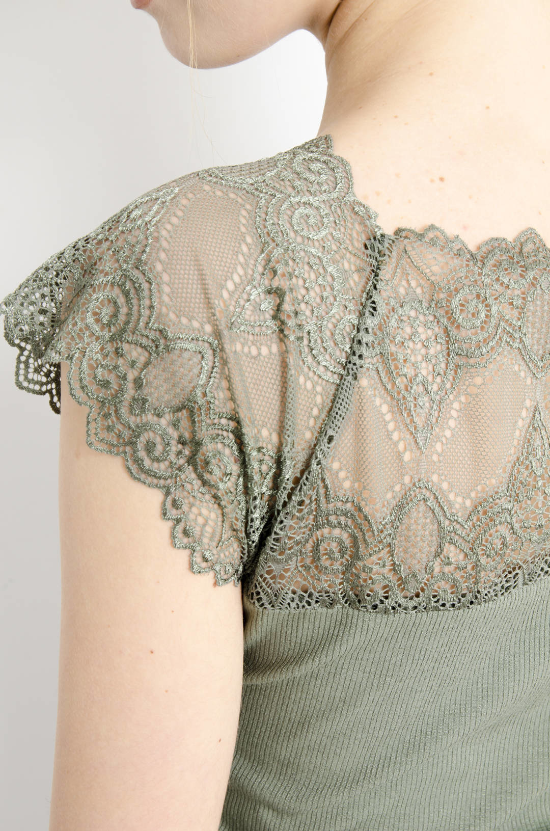 BLUZKA PRĄŻKOWANA Z KORONKĄ - KHAKI