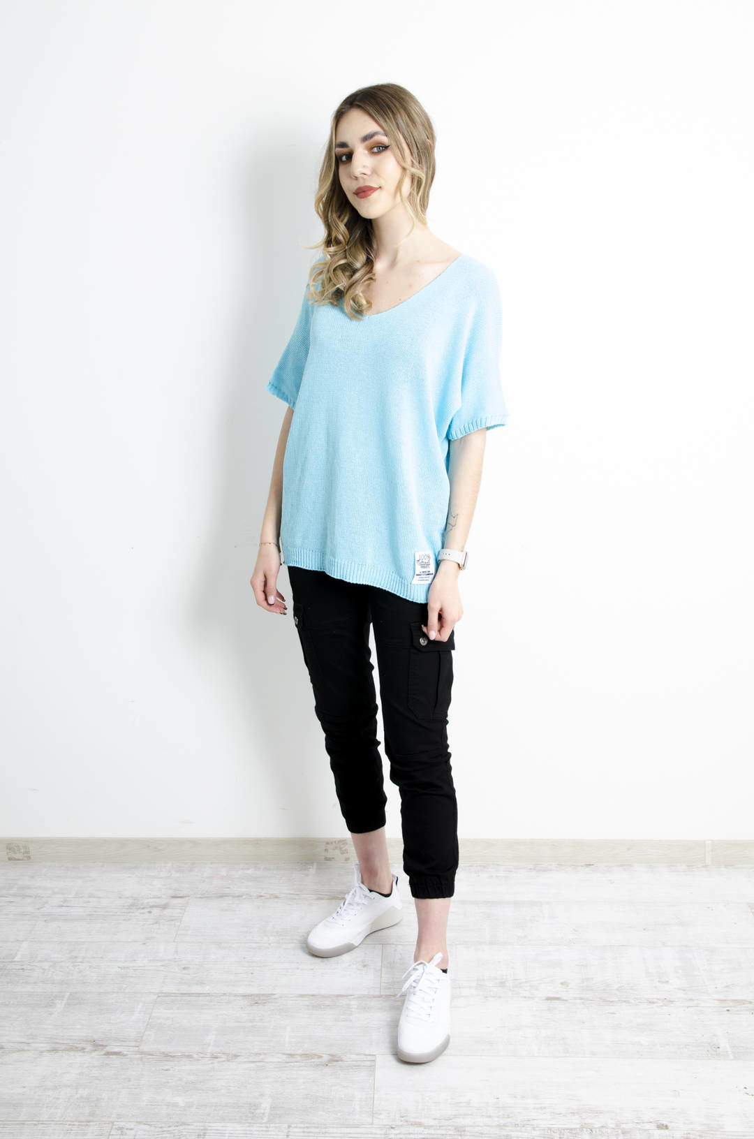 SWETER DZIANINOWY OVERSIZE Z KRÓTKIM RĘKAWEM- NIEBIESKI