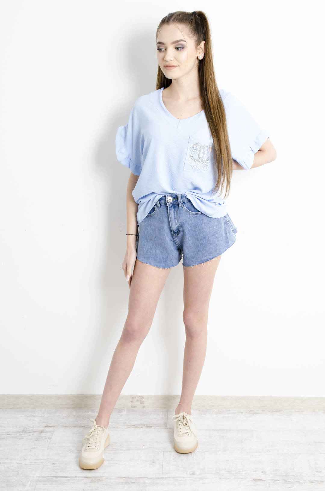 T-SHIRT Z OZDOBNYM ŁAŃCUSZKIEM I FALBANKAMI PRZY RĘKAWACH- NIEBIESKI
