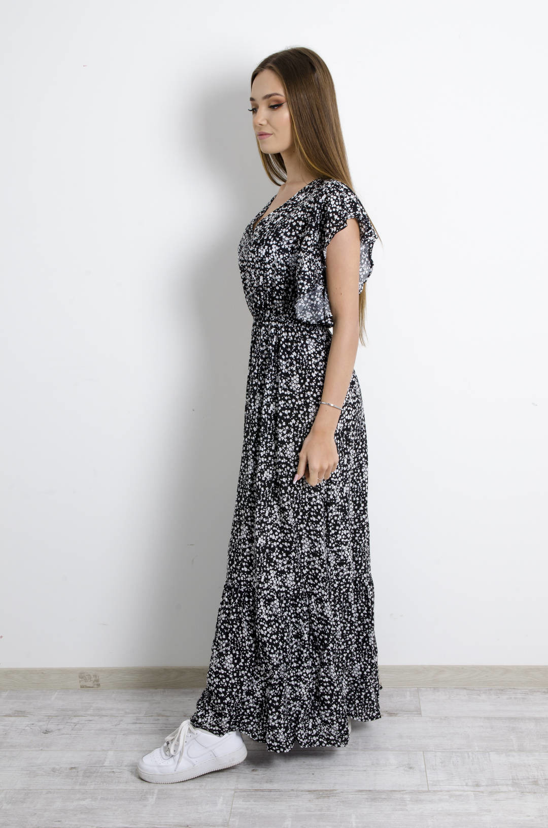 SUKIENKA MAXI W KWIATKI Z FALBANAMI PRZY RĘKAWACH- CZARNA