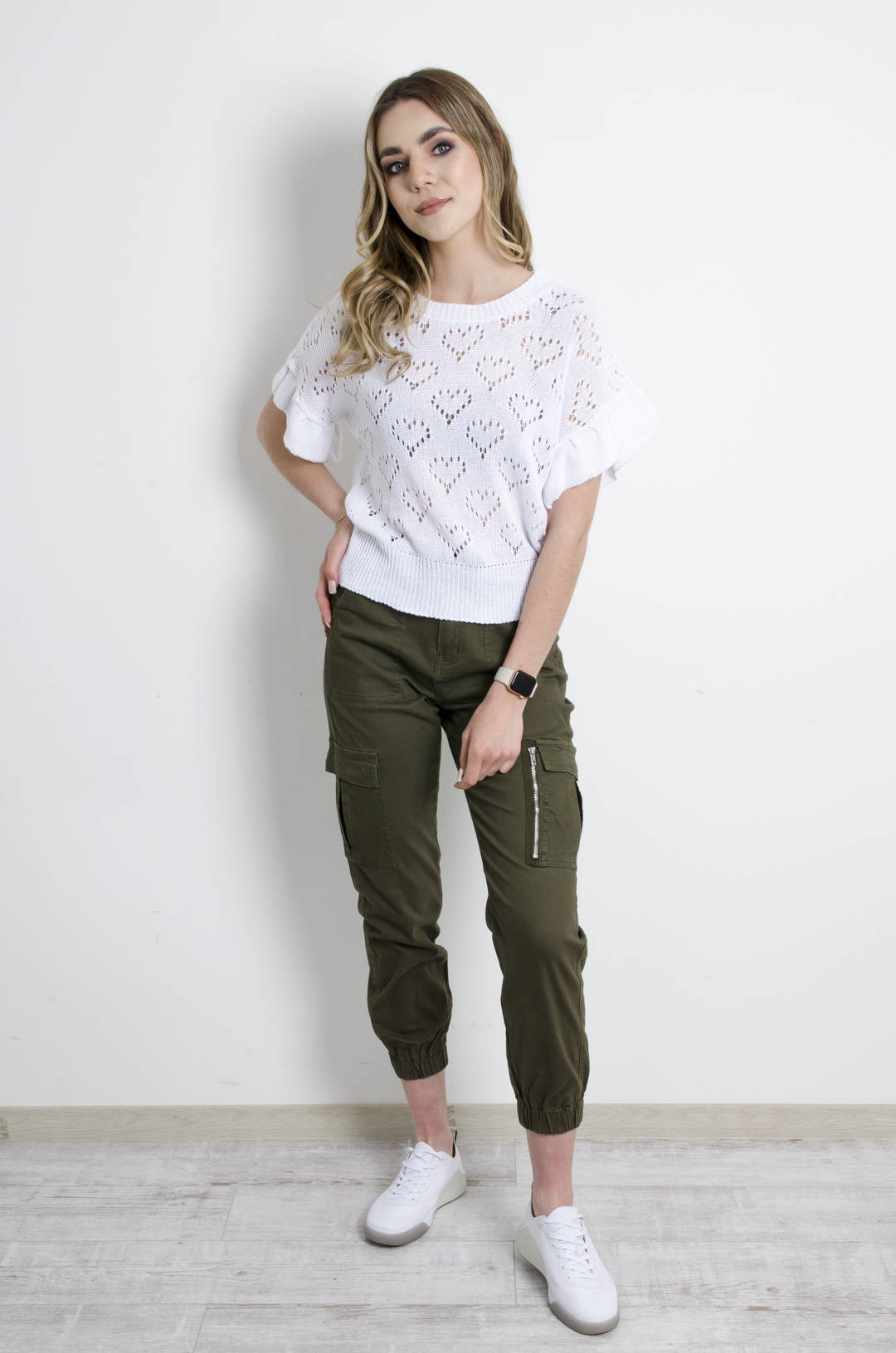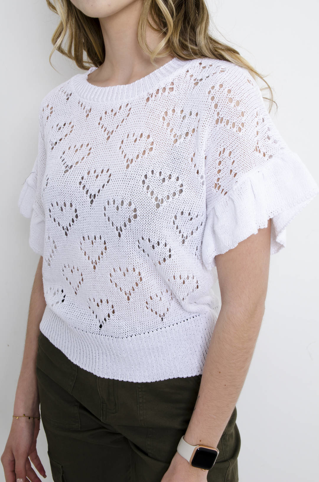 SWETEREK W SERDUSZKA AŻUROWY Z FALBANAMI PRZY RĘKAWACH- BIAŁY
