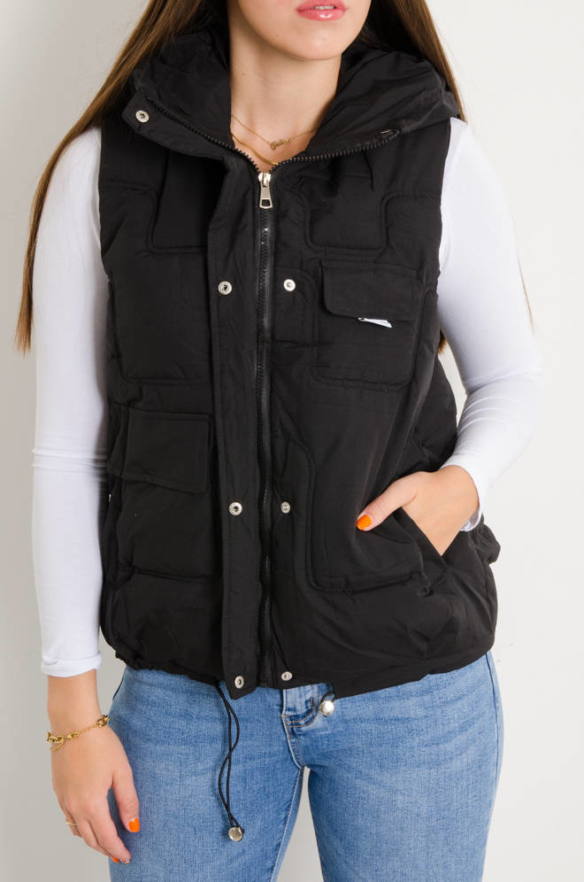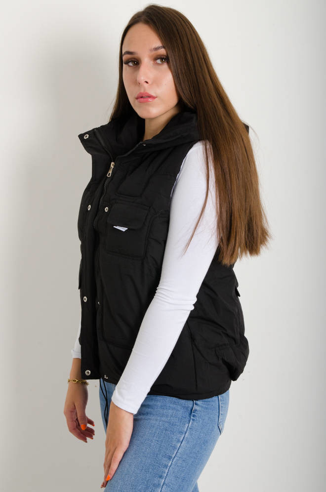 CZARNA KAMIZELKA Z KAPTUREM I KIESZENIĄ