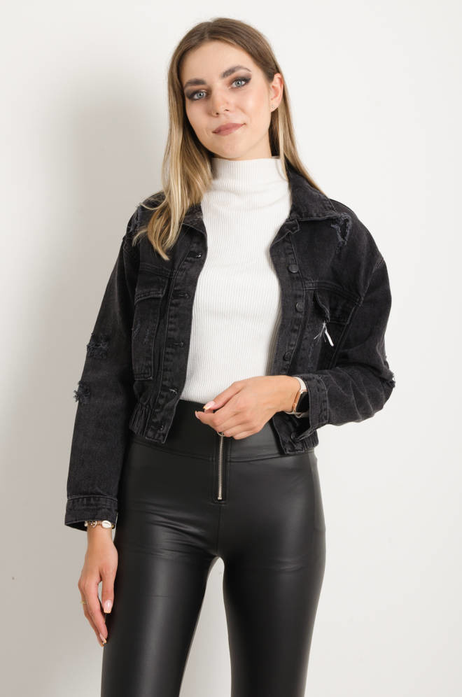 KURTKA JEANSOWA Z GUMĄ I PRZETARCIAMI- CZARNA