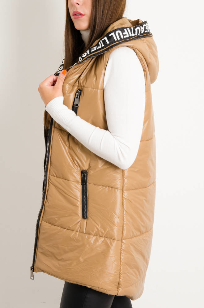 DŁUGA ASYMETRYCZNA KAMIZELKA Z OZDOBNYM PASEM- BRĄZOWA