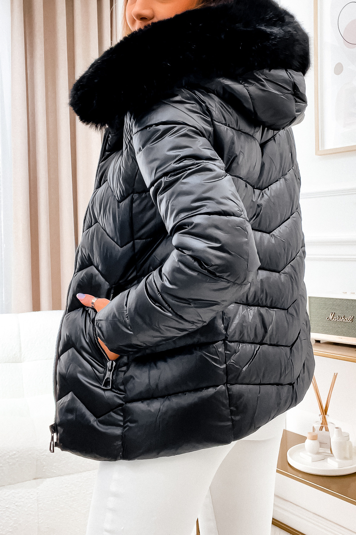 PIKOWANA POŁYSKUJĄCA KURTKA Z FUTERKIEM- CZARNA
