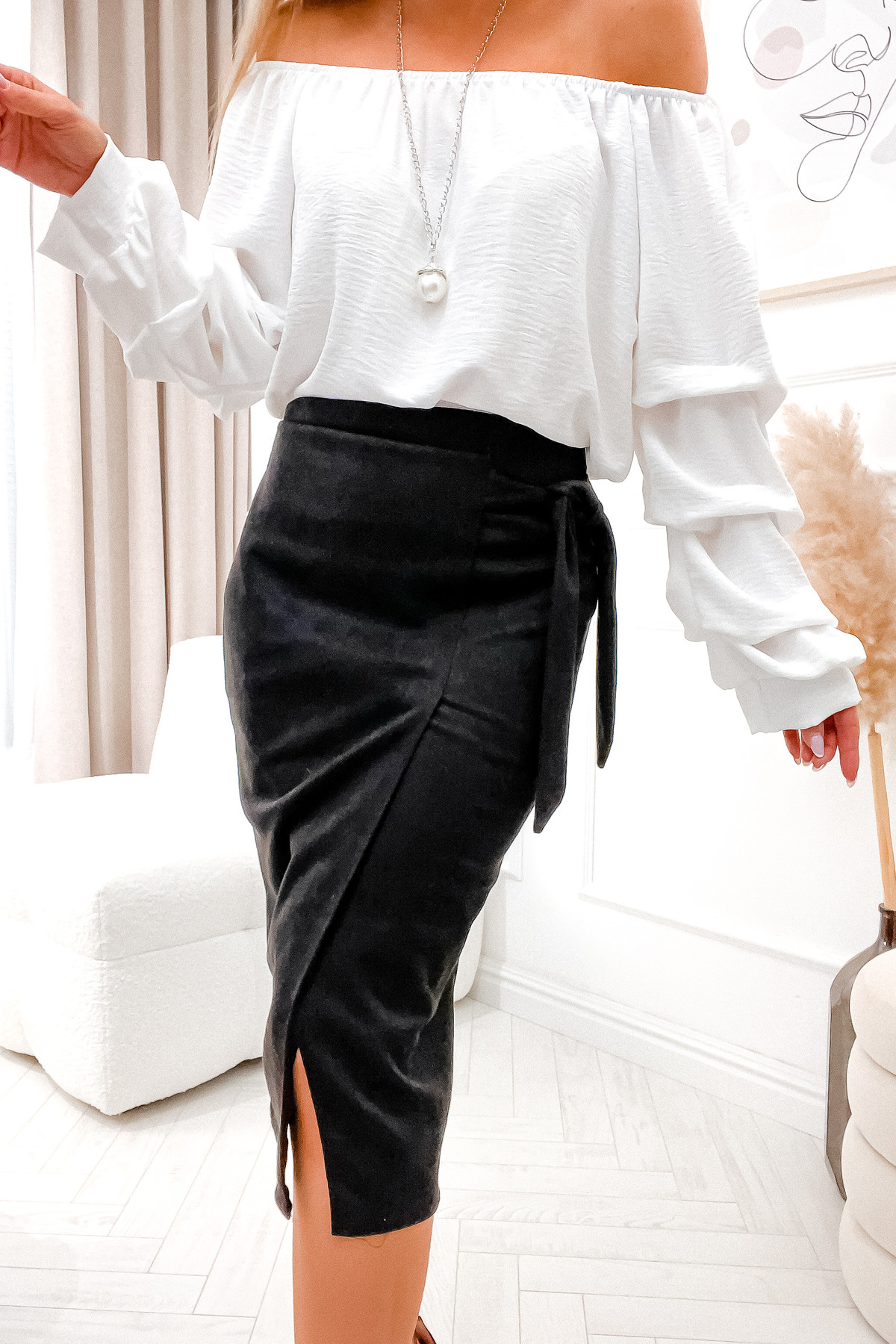 WELUROWA SPÓDNICA MIDI Z OZDOBNYM WIĄZANIEM- CZARNA