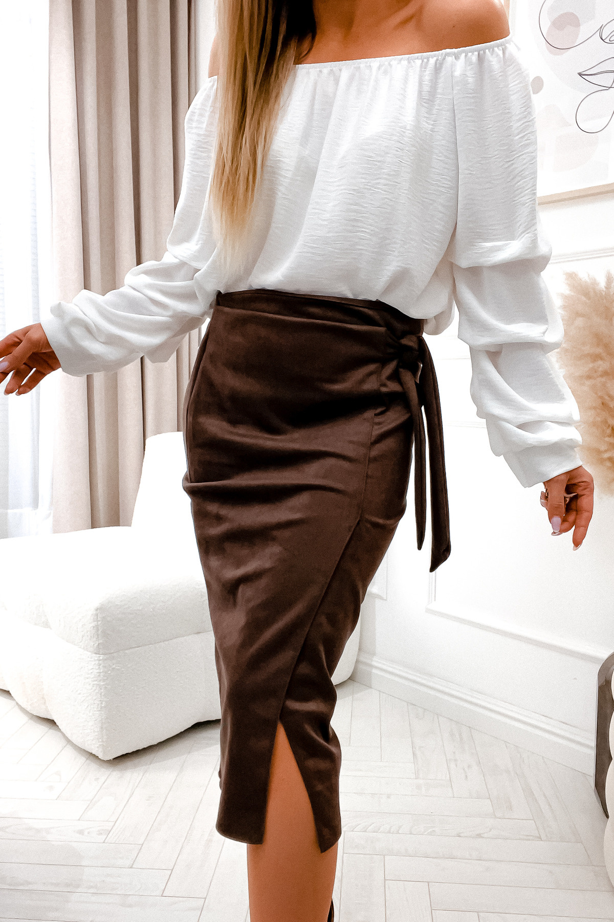 WELUROWA SPÓDNICA MIDI Z OZDOBNYM WIĄZANIEM- BRĄZOWA