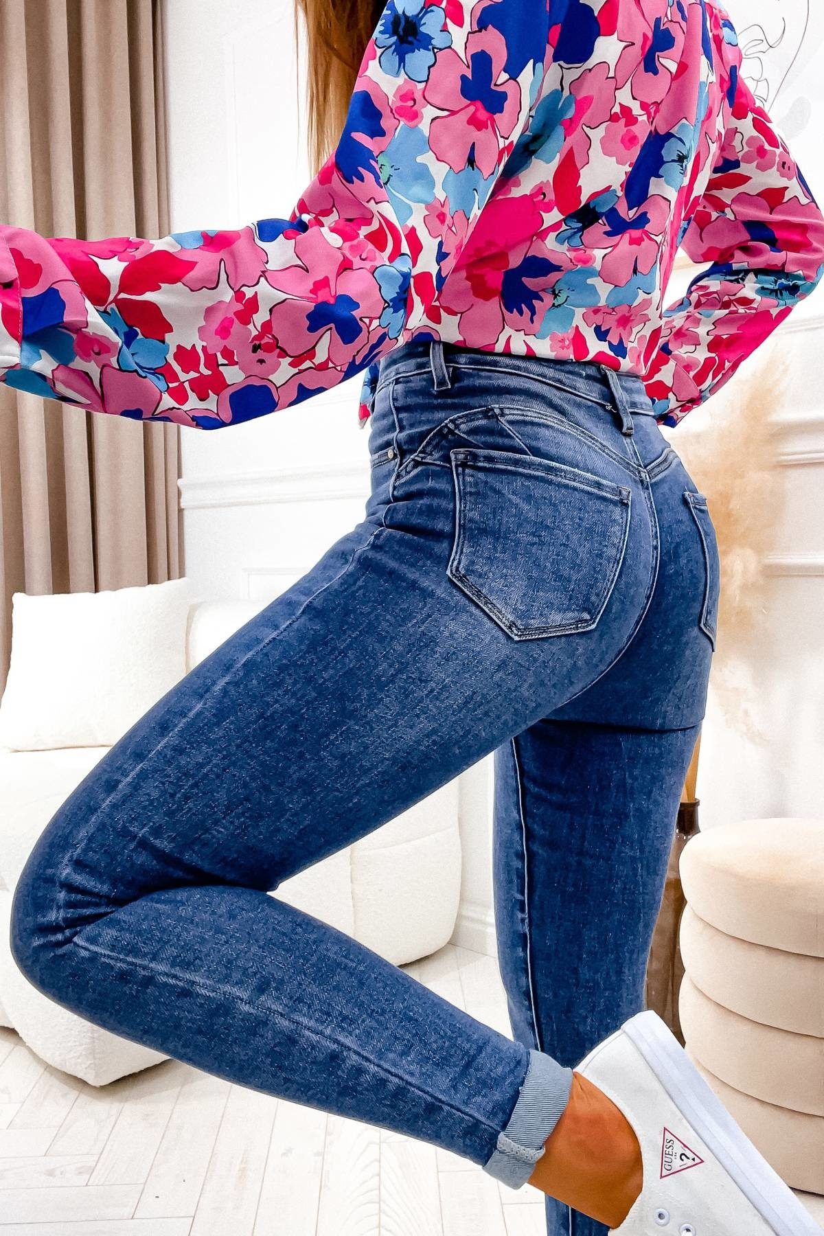 GRANATOWE SPODNIE JEANSOWE PUSH UP Z PRZETARCIAMI- BARDZO WYSOKI STAN