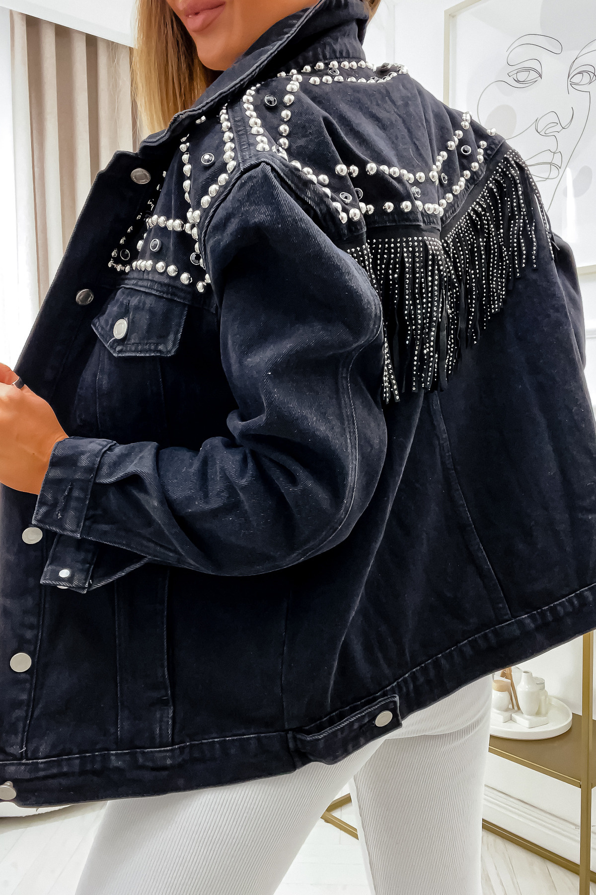 CZARNA KURTKA JEANSOWA Z OZDOBNYMI DŻETAMI I FRĘDZLAMI