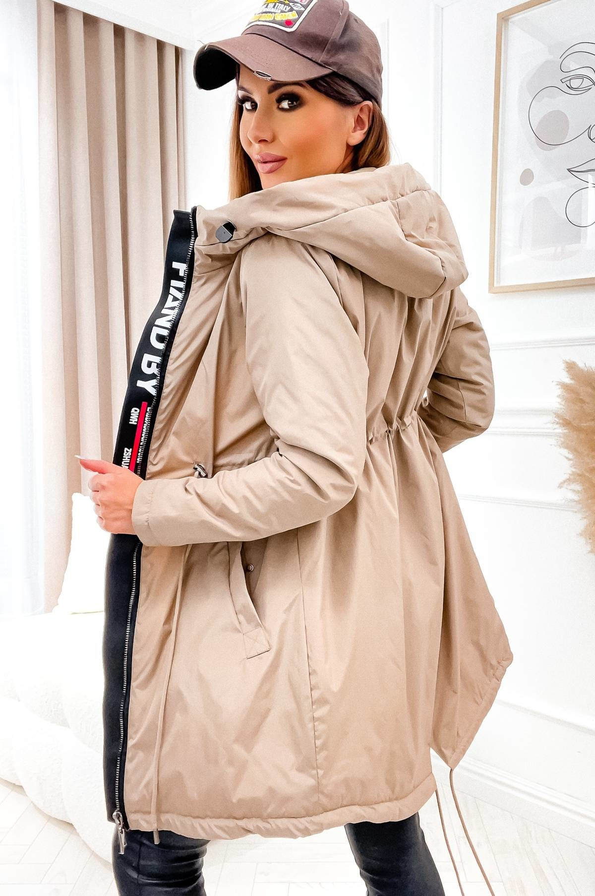 KURTKA PARKA Z KAPTUREM I ŚCIĄGACZEM W PASIE- BEŻOWA