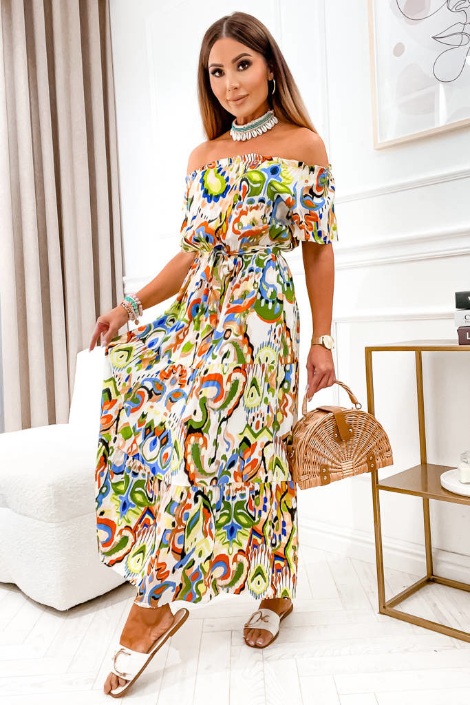WZORZYSTA SUKIENKA MAXI Z FALBANAMI WIĄZANA W PASIE- POMARAŃCZOWA