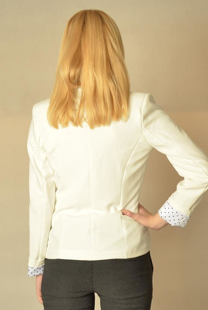 Elegancki żakiet z wywijanymi rękawami i printem w kropeczki. Sprawdzi się dobrze do pracy i jak do luźniejszej stylizacji.