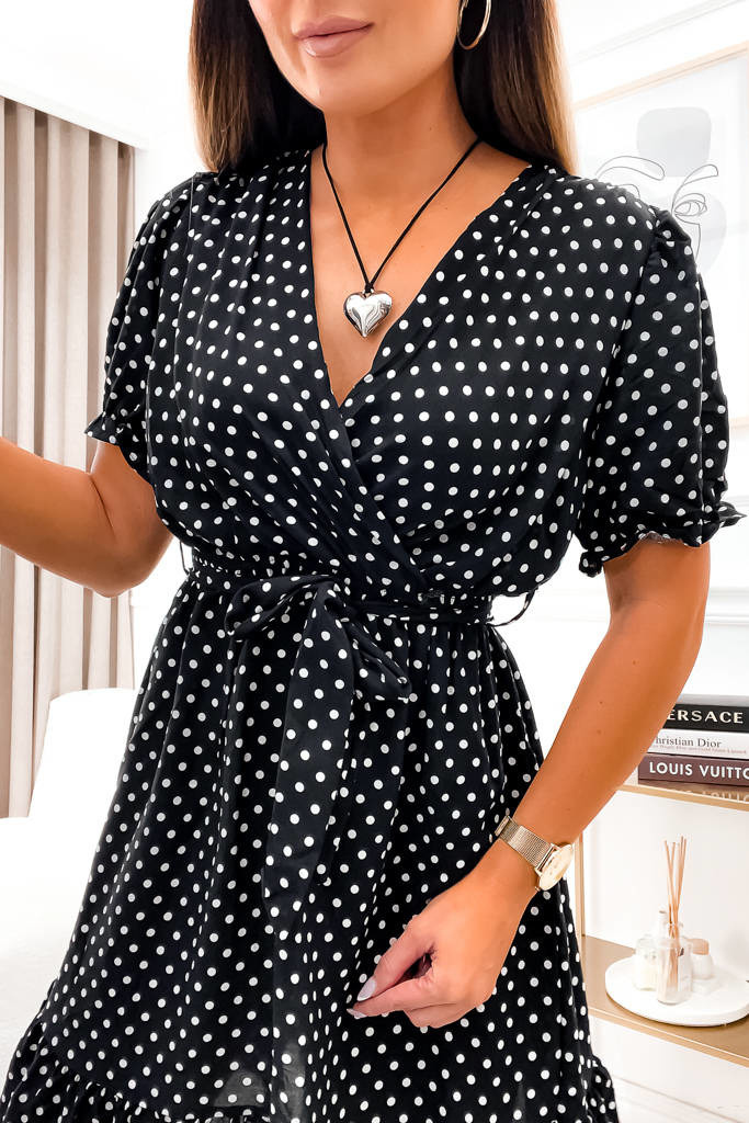 SUKIENKA MINI W KROPKI Z KOPERTOWYM DEKOLTEM- CZARNA