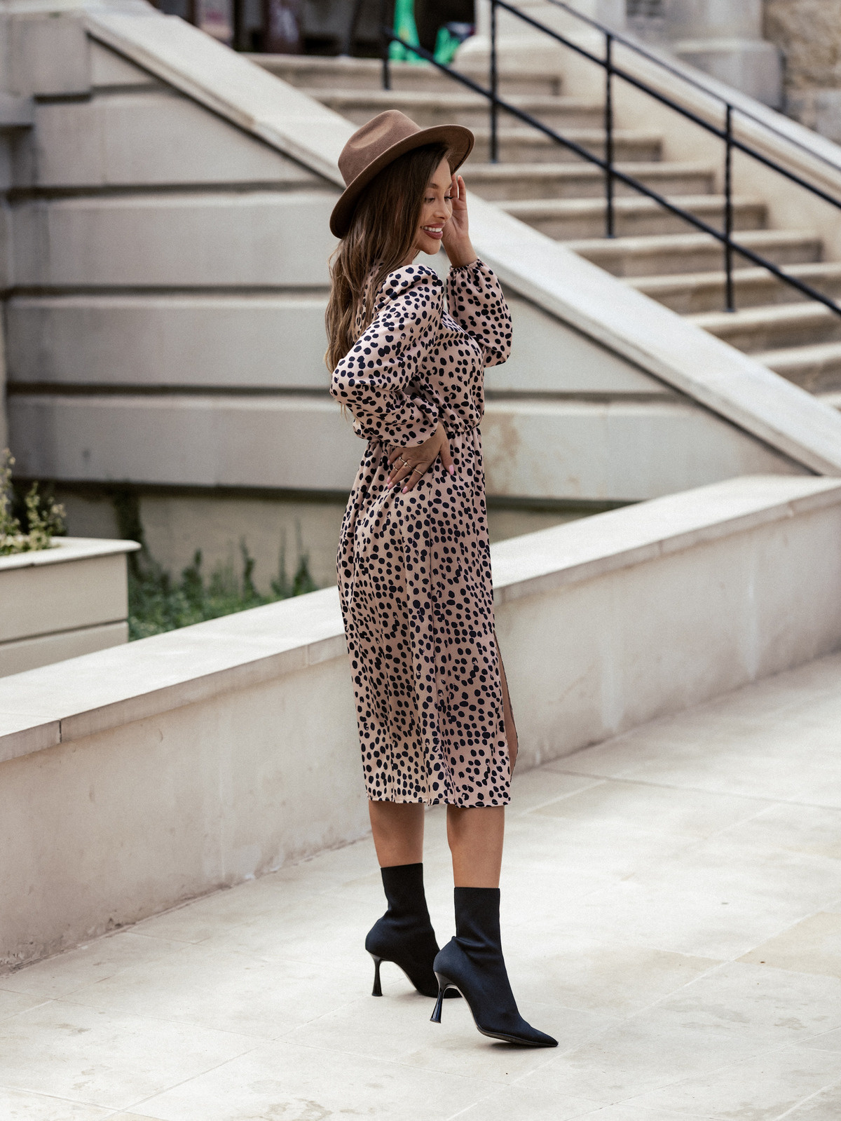 SUKIENKA W KROPKI Z GUMĄ W PASIE I ROZPORKIEM- CAPPUCCINO