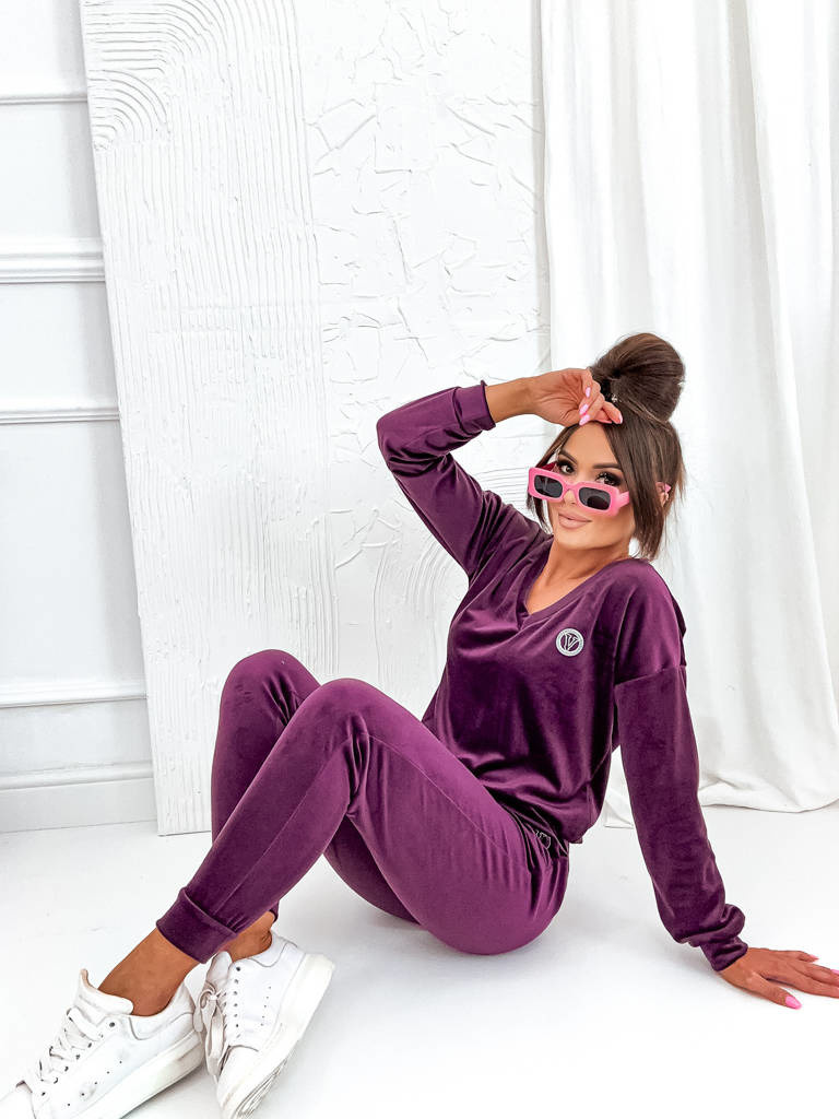 WELUROWY KOMPLET DRESOWY BLUZA W SZPIC + SPODNIE Z NASZYWKĄ- ŚLIWKOWY