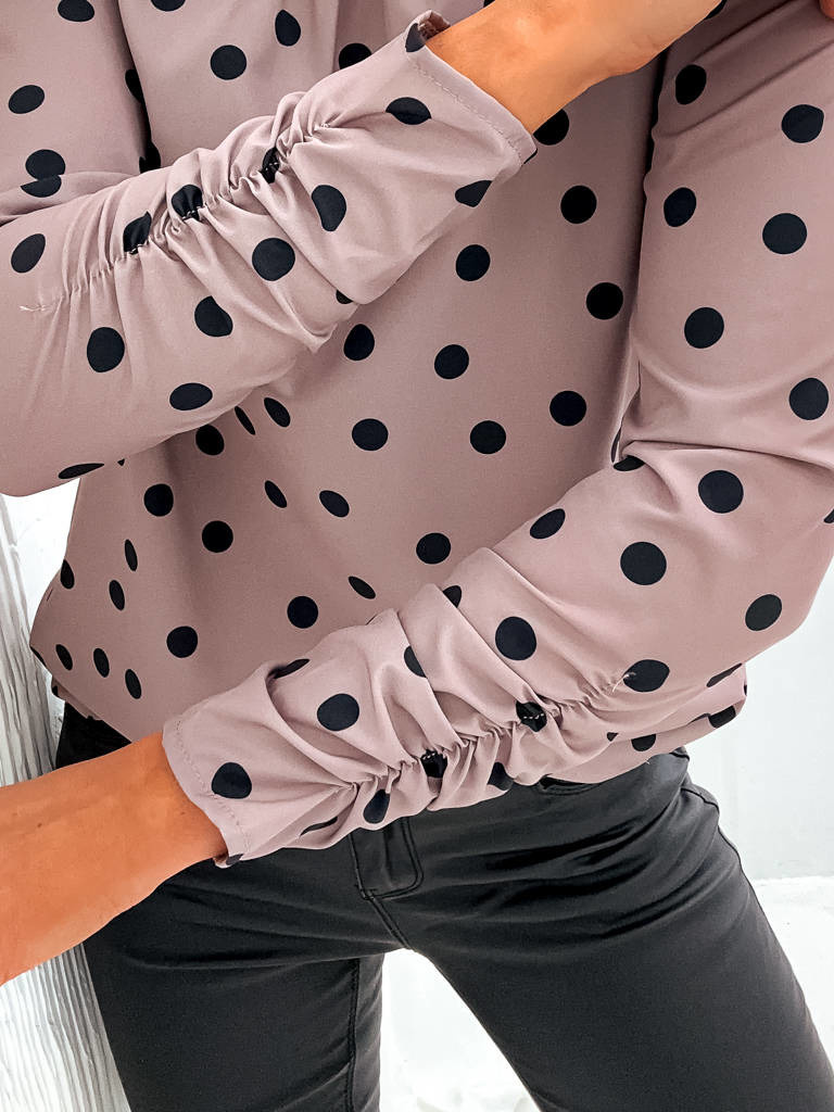 BLUZKA W BRĄZOWE KROPKI ZE ŚCIAGACZEM NA RĘKAWIE- CAPPUCCINO