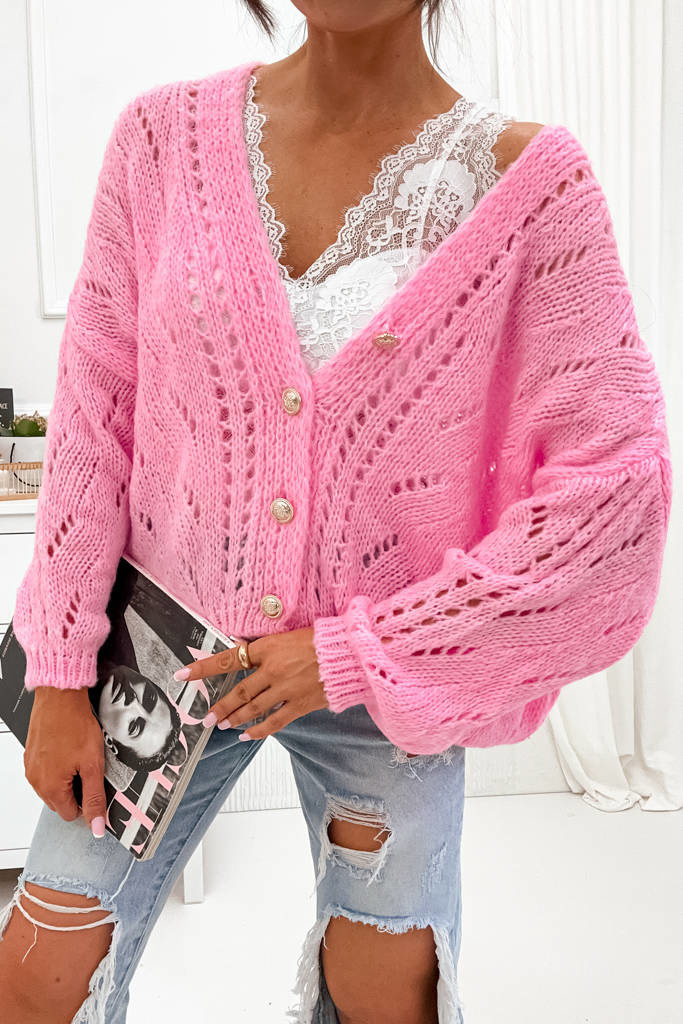 LUŹNY SWETER ROZPINANY ZE ZŁOTYMI GUZIKAMI-  JASNO RÓŻOWY