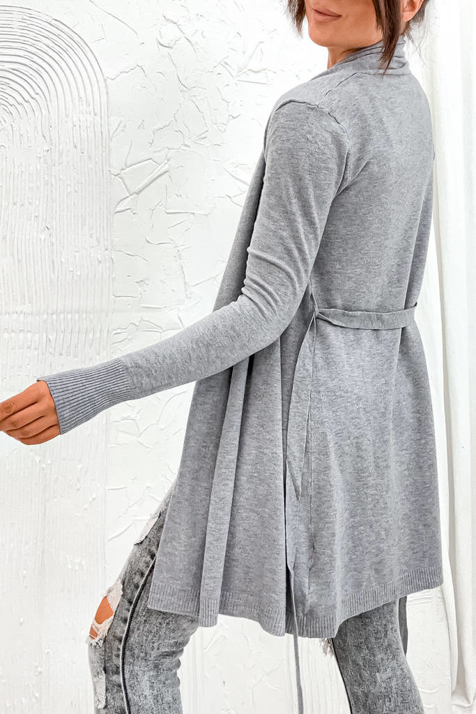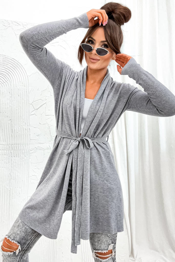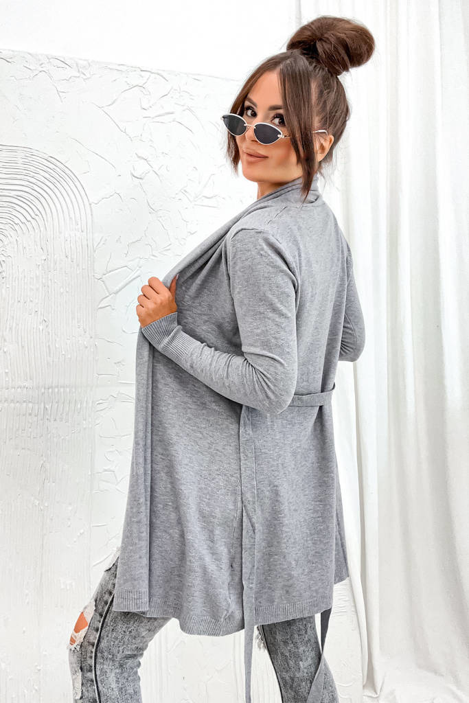 DZIANINOWA NARZUTA Z WIĄZANIEM W PASIE- SZARA