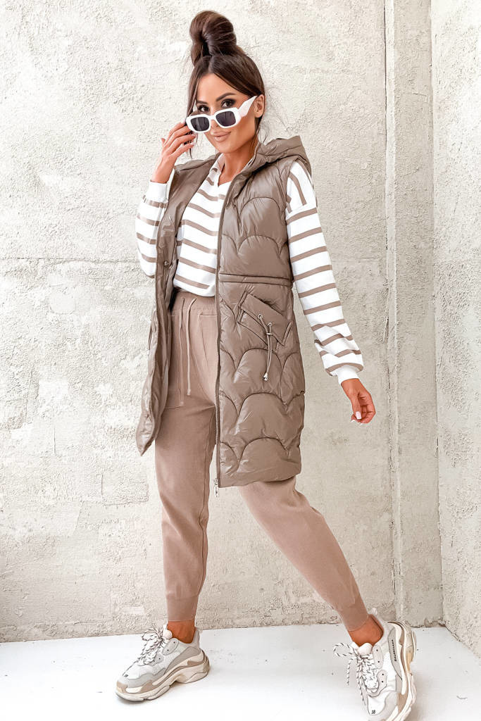 KAMIZELKA Z KAPTUREM I OZDOBNYMI KIESZENIAMI- BRĄZOWA