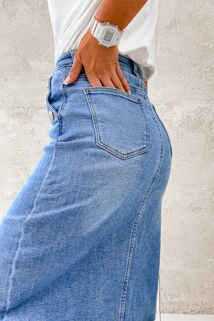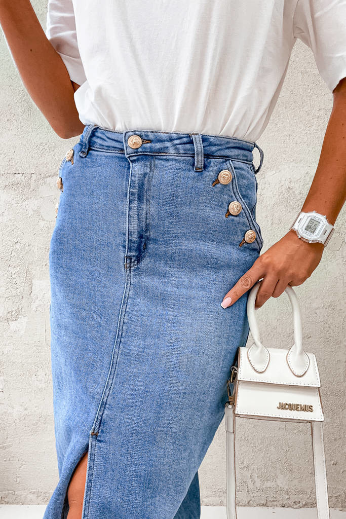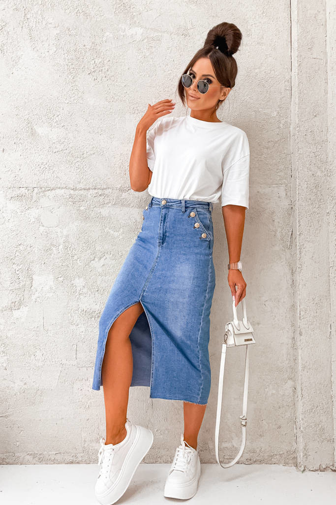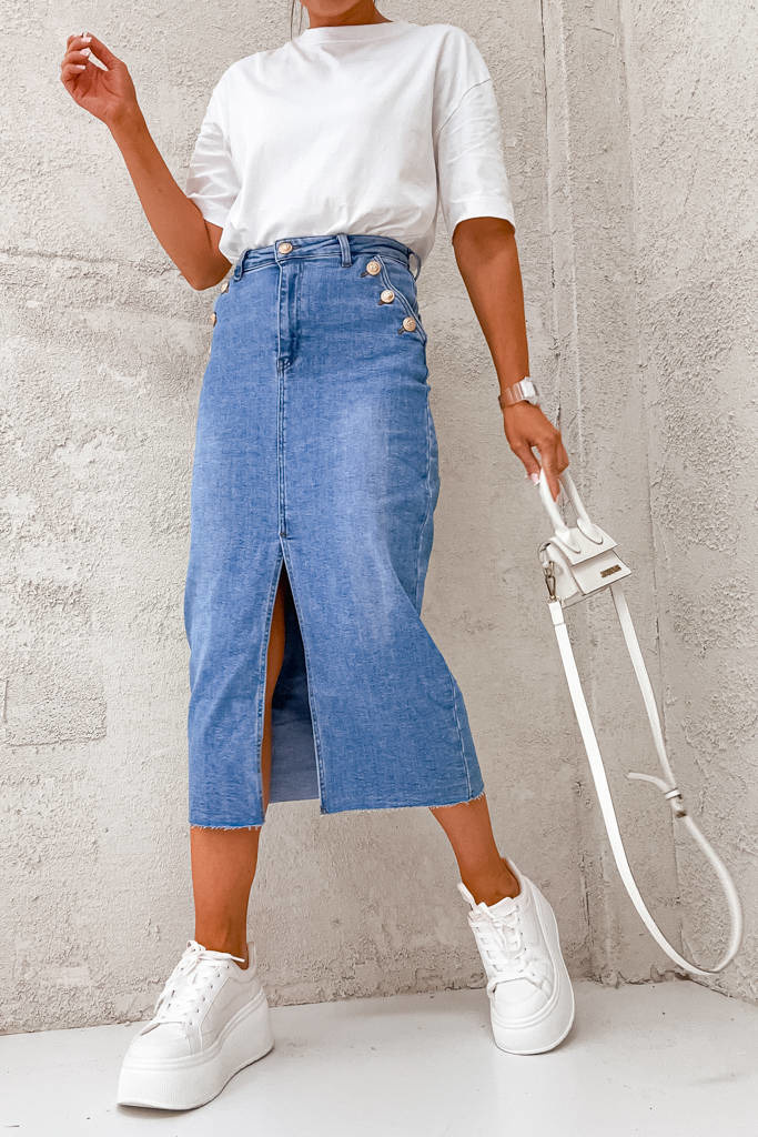 SPÓDNICA JEANSOWA MIDI Z ROZCIĘCIEM I OZDOBNYMI GUZIKAMI