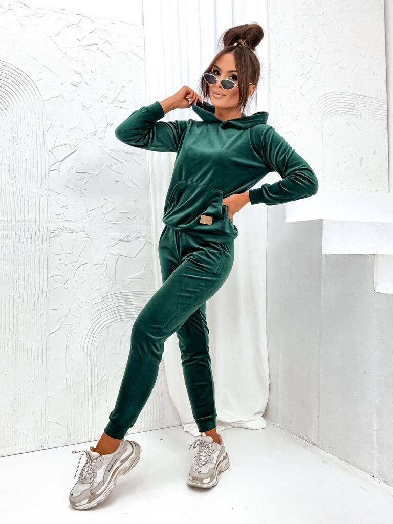 WELUROWY KOMPLET DRESOWY SPODNIE+ BLUZA Z KAPTUREM- BUTELKOWO ZIELONY