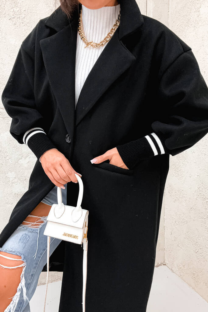 CZARNY PŁASZCZ ZE ŚCIĄGACZAMI PRZY RĘKAWACH