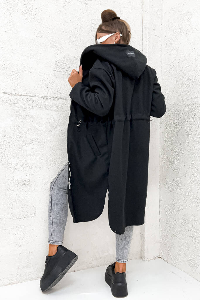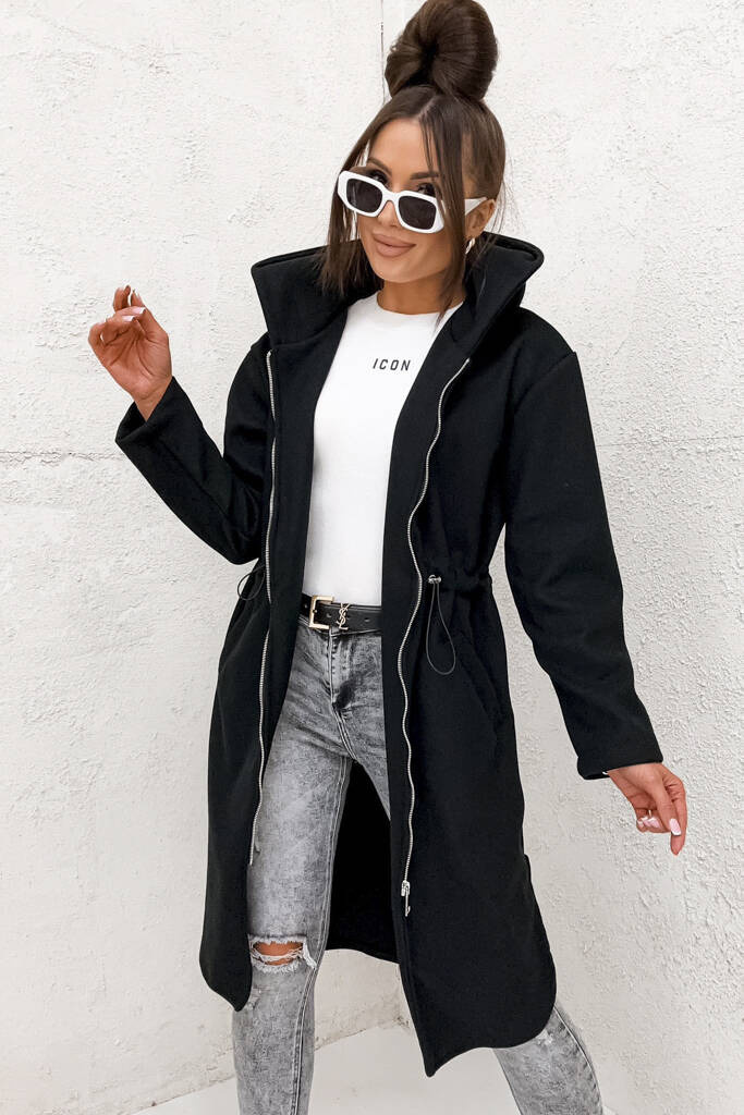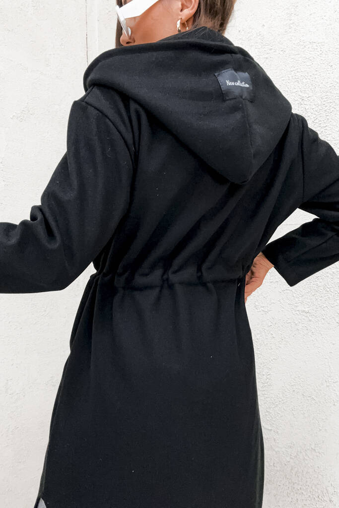PŁASZCZ POLAROWY Z KAPTUREM I ŚCIAGACZEM W PASIE- CZARNY
