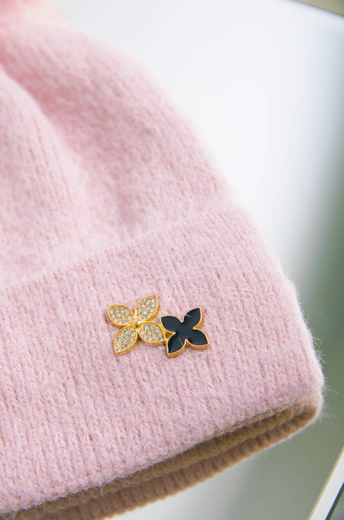 ZIMOWA CZAPKA Z POMPONEM I OZDONYM KWIATKIEM- JASNO RÓŻOWA