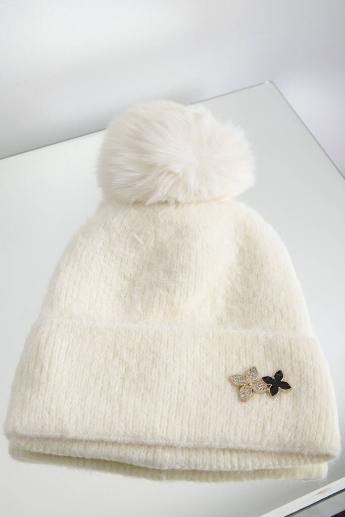 ZIMOWA CZAPKA Z POMPONEM I OZDONYM KWIATKIEM- BIAŁA