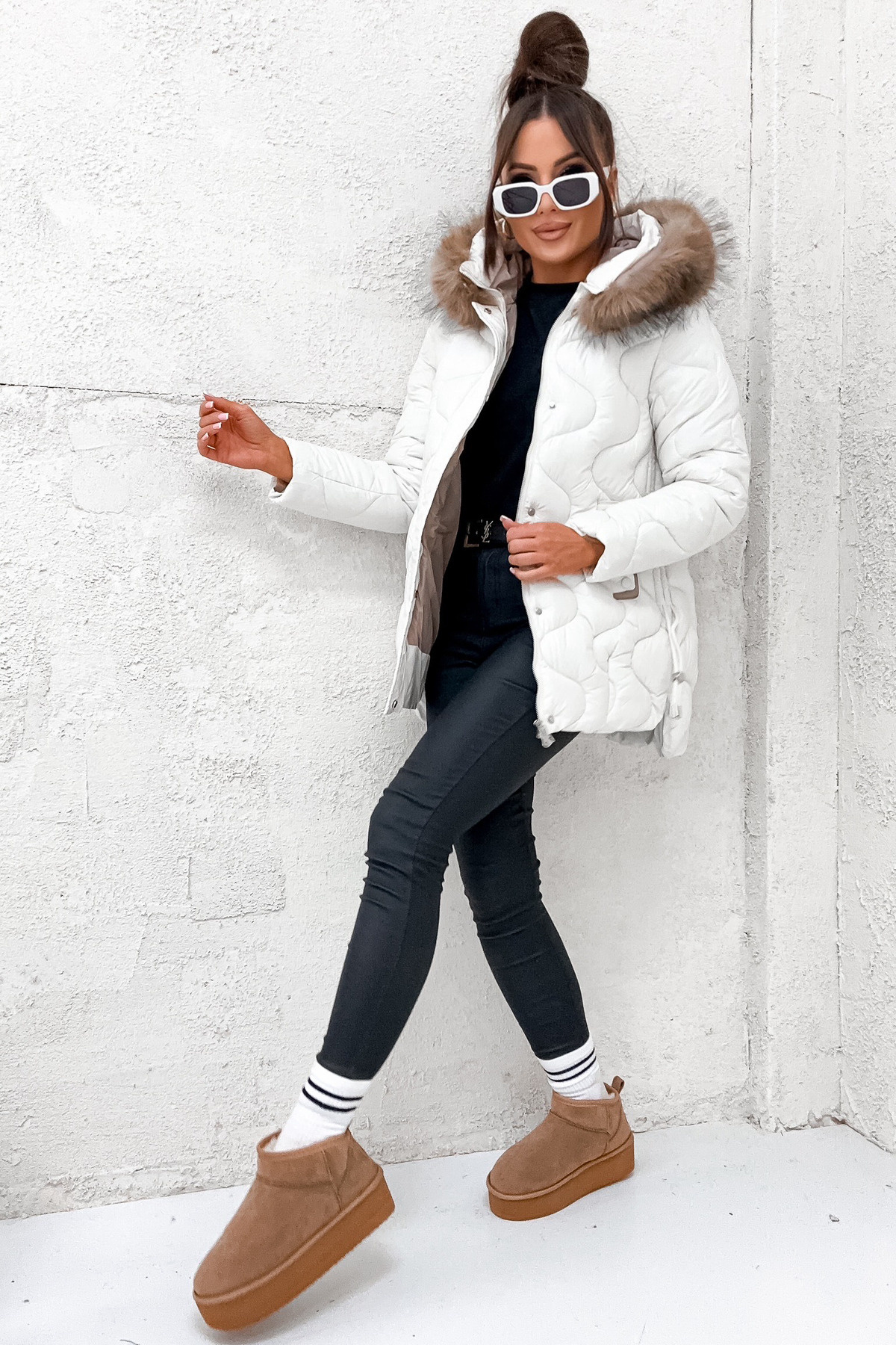 KURTKA PIKOWANA Z KAPTUREM I ŚCIĄGACZAMI PO BOKACH- BIAŁA