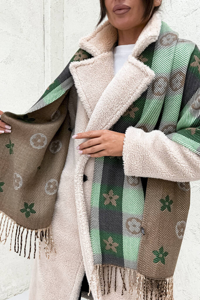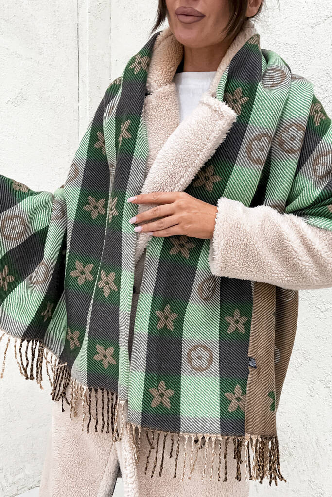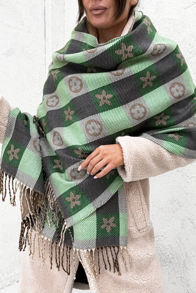 SZAL W KRATE Z MOTYWEM KWIATA Z FRĘDZLAMI- ZIELONY