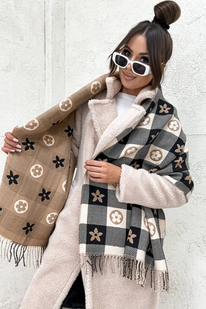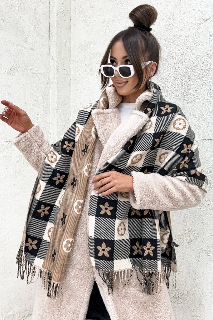 SZAL W KRATE Z MOTYWEM KWIATA Z FRĘDZLAMI- BEŻOWY