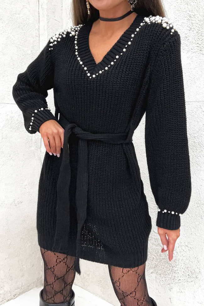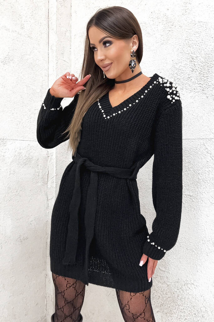 DŁUGI SWETER OVERSIZE Z KORALIKAMI I WIAZANIEM W PASIE- CZARNY