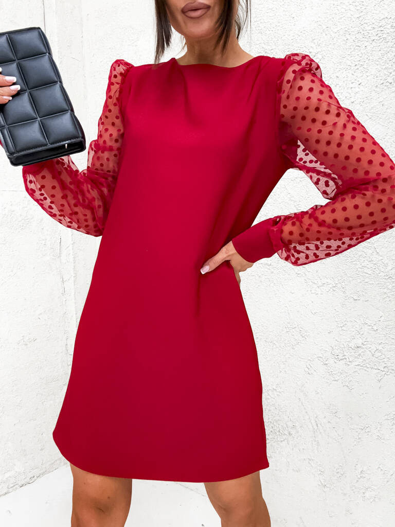 TRAPEZOWA SUKIENKA Z TIULOWYMI RĘKAWAMI W KROPKI- CZERWONA