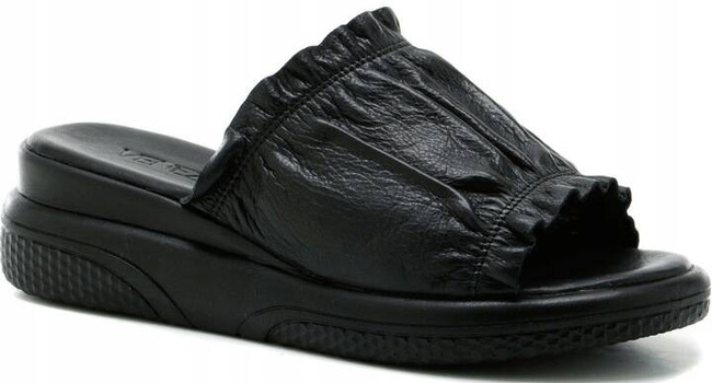 Klapki wykonane z miękkiej skóry naturalnej w kolorze czarnym. Model na wygodnej podwyższanej podeszwie. Oryginalny charakter cholewki wyrażony poprzez dekoracyjne marszczenie. Elastyczna wstawka umieszczona po wewnętrznej stronie ułatwi zakładanie buta. Skórzana wkładka z wypełnieniem zapewni komfort użytkowania także podczas aktywnych dni.