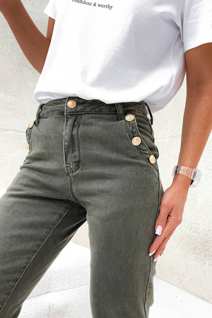 SPODNIE MOM FIT Z OZDOBNYMI GUZIKAMI NA KIESZENIACH - ZIELONE