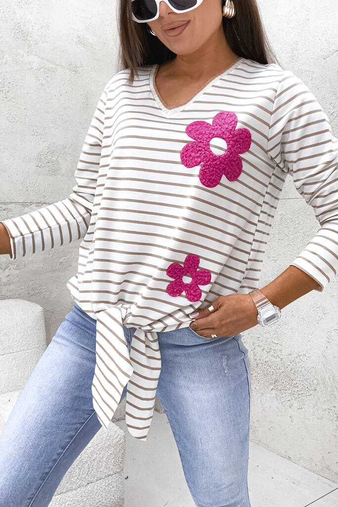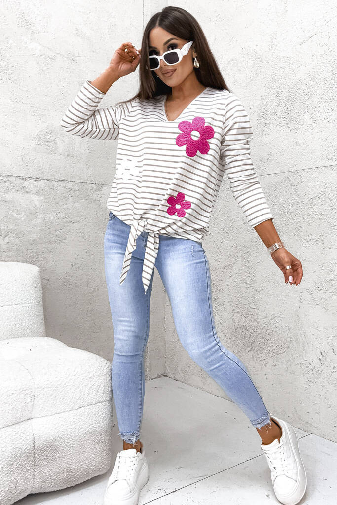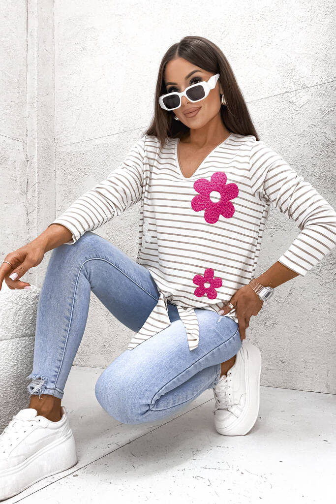 BLUZKA ONESIZE W PASKI Z KWIATKAMI- BEŻOWA