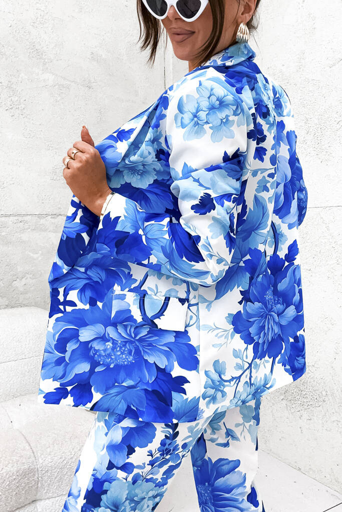 ELEGANCKI KOMPLET W KWIATY MARYNARKA+ SPODNIE- NIEBIESKI
