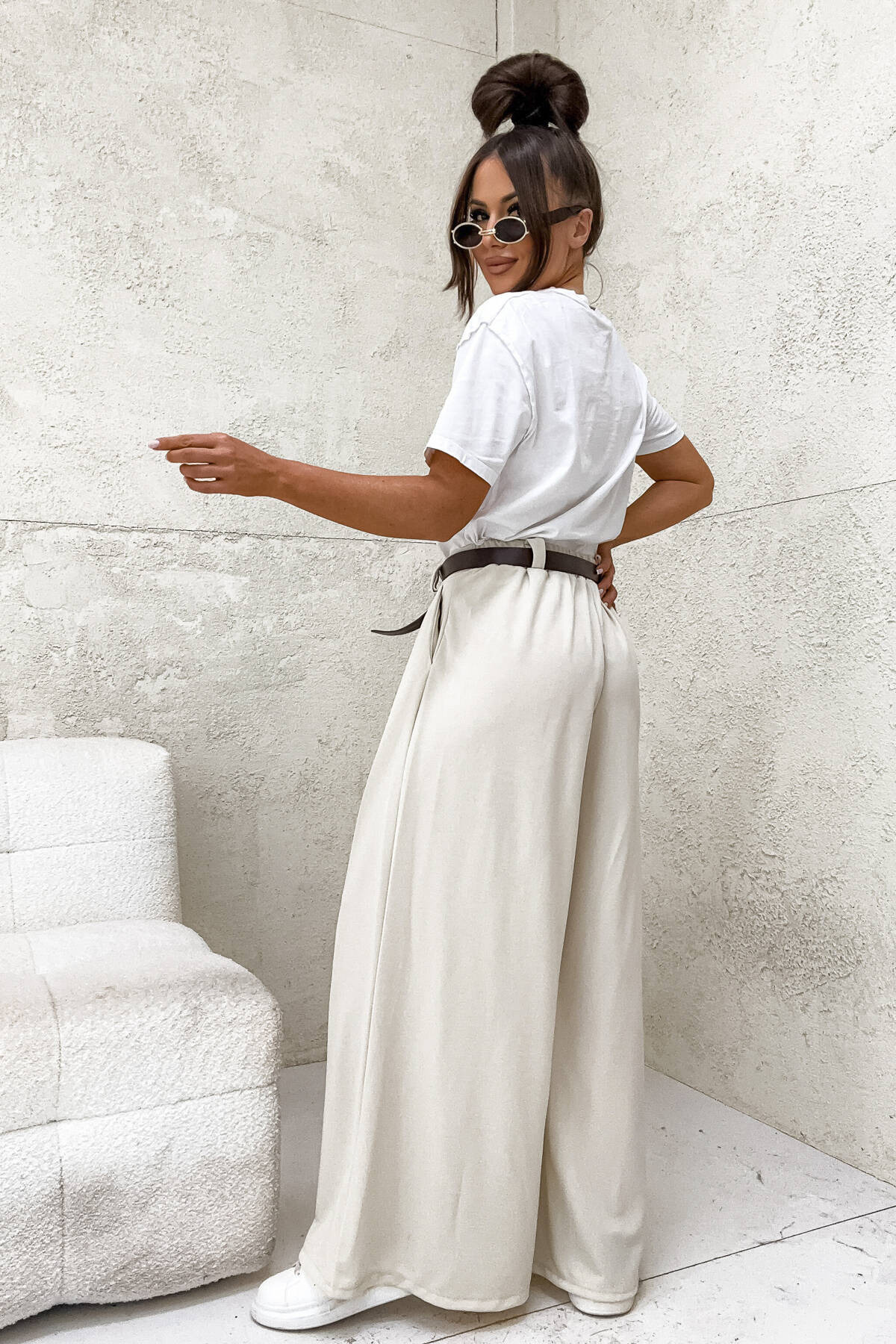 SZEROKIE SPODNIE ONESIZE Z WYSOKIM STANEM I PASKIEM- BEŻOWE