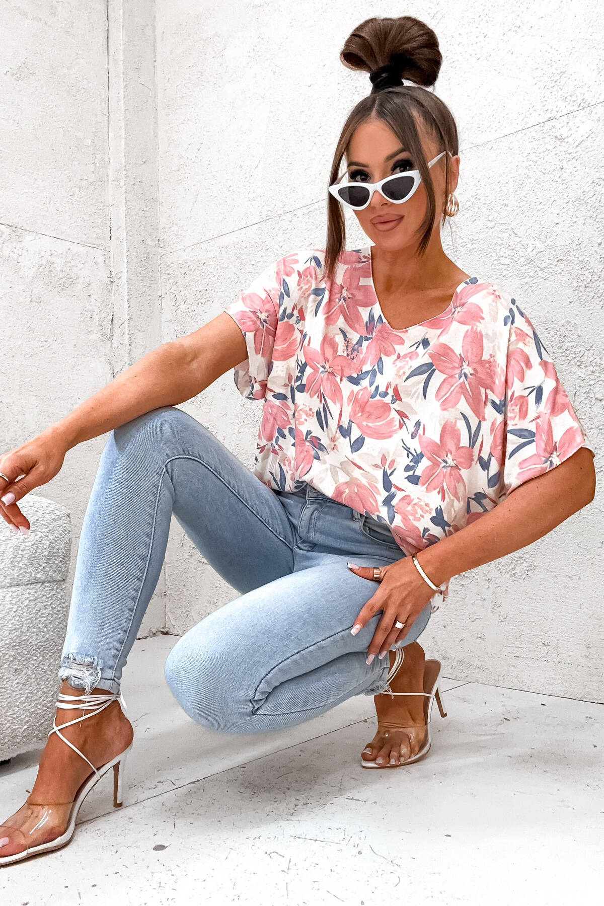BLUZKA ONESIZE W SZPIC Z MOTYWEM KWIATOWYM- RÓŻOWA